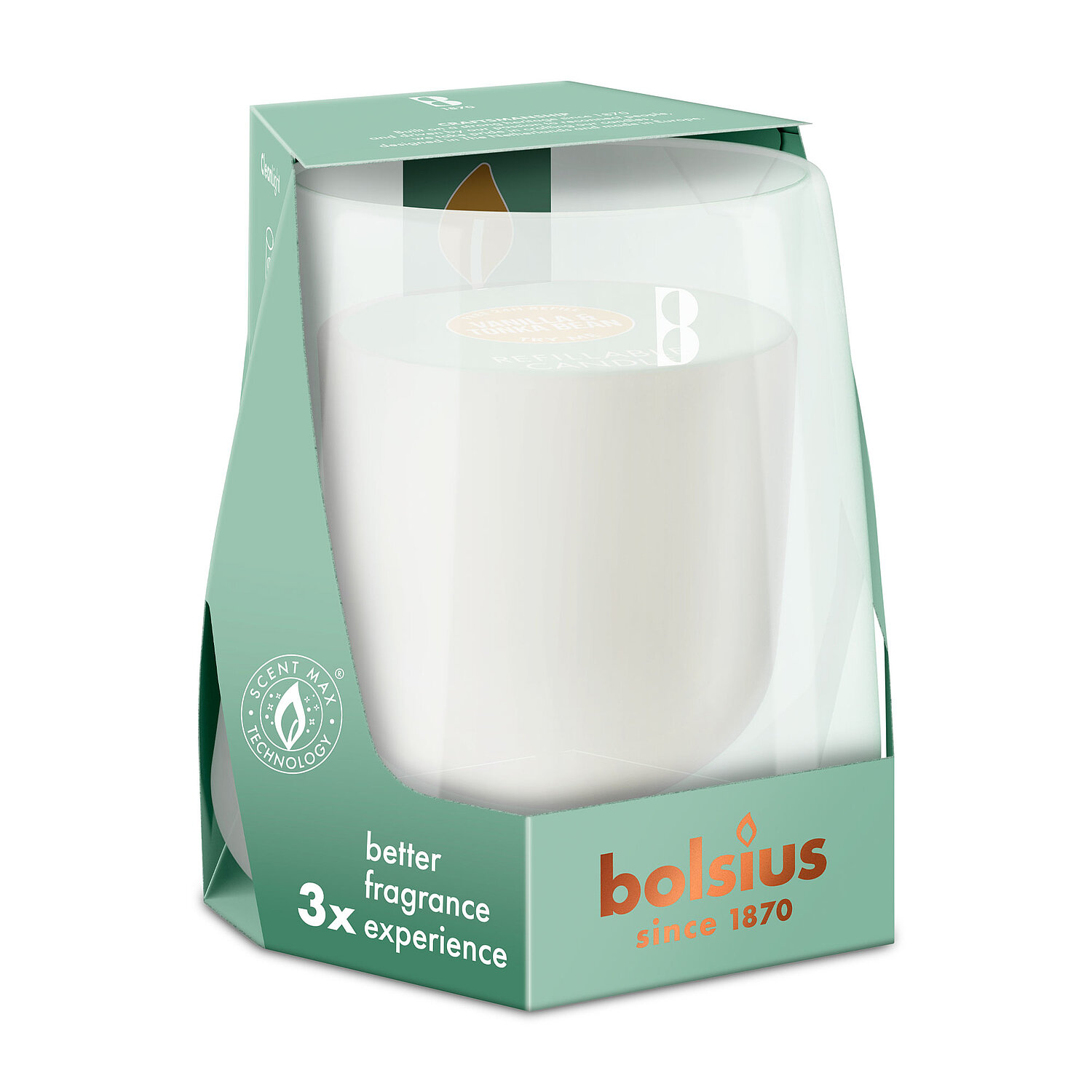Ein Bolsius Cleanlight Starterkit bestehend aus einem weißen Glashalter und einer Duftkerze mit Vanille/Tonkabohne-Duft in einer stylischen grünen Verpackung mit Bolsius Schriftzug.